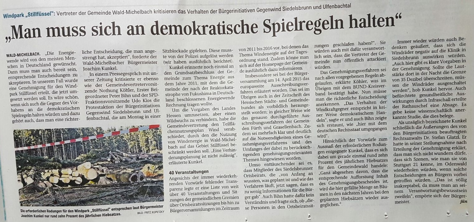 Wer gedacht hatte, es könnte nicht mehr tiefer und absurder in der Diskussion rund um den Windindustriepark Stillfüssel gehen, der musste sich leider wieder einmal eines Besseren belehren lassen. Der noch amtierende Bürgermeister Joachim Kunkel, Gemeindevertretervorsitzender Nothung Köhler, Erster Beigeordneter Peter Bihn und SPD-Fraktionsvorsitzender Udo Klos verurteilten die Sitzblockade der Bürgerinitiativen Siedelsbrunn und Ulfenbachtal am 13. Februar 2017 und kritisierten diese auf höchst fragliche Art und Weise. Den Windkraftgegnern wurden kurzerhand die Grundrechte auf Demonstrations- bzw. Versammlungsfreiheit (Art. 8 GG) und Meinungsfreiheit (Art. 5 GG) abgesprochen. Schließlich "müsse man sich an demokratische Spielregeln halten", die wohl neuerdings von lokalen Bürgermeistern und Gemeindevertretern nach eigenem Gusto festgelegt werden.
